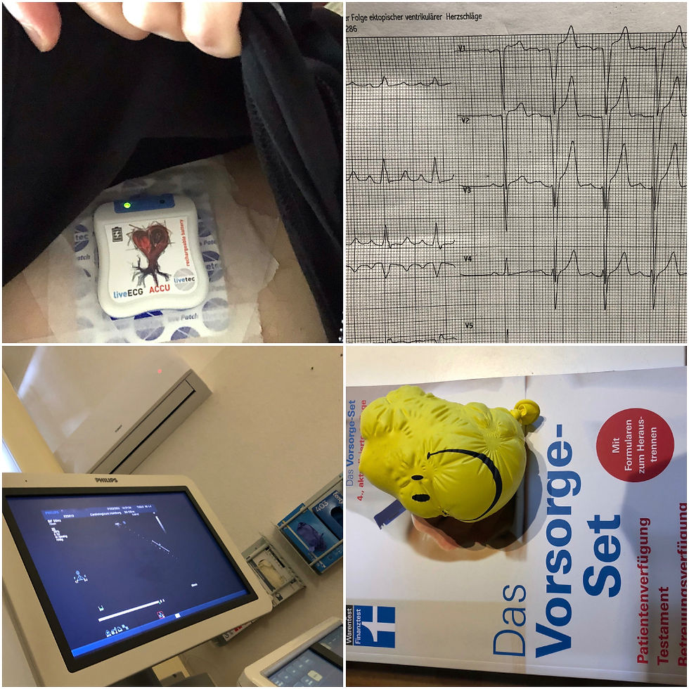 (4) Ganz habe ich selber den Bogen noch nicht raus: mein Herz (250g) ändert den Takt alle paar Sekunden, schießt öfters gleich ein paar Salven Blut auf einmal aus der Kammer und macht dann eigensinnige Pausen, leider auch mal länger als mir bekommt. „Er ist ja so ein impulsiver Typ!“, wird oft über mich geflüstert. Unter der Haut aber auch hier nur unnützer Elektrokram. Das muss alles raus, sagt die Ärztin.